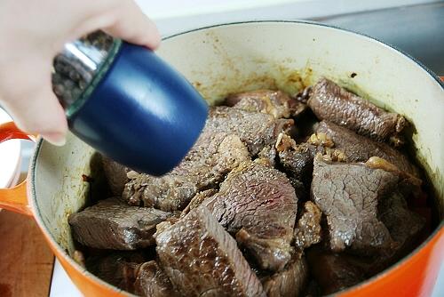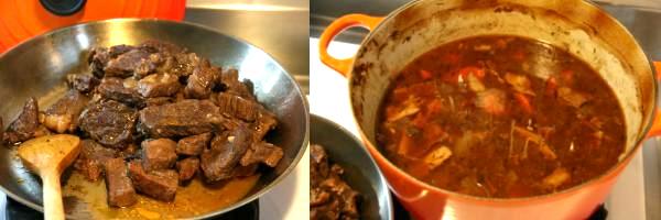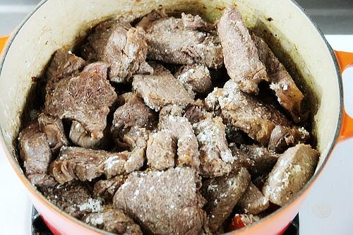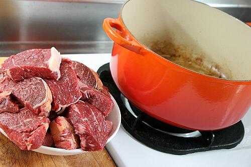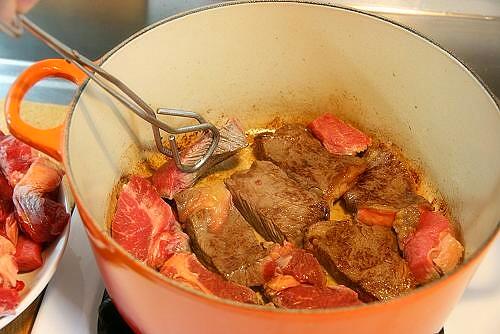↓ 炒好培根拿出來。再把1500g牛肉切成5公分塊狀的牛肉入鍋煎一煎