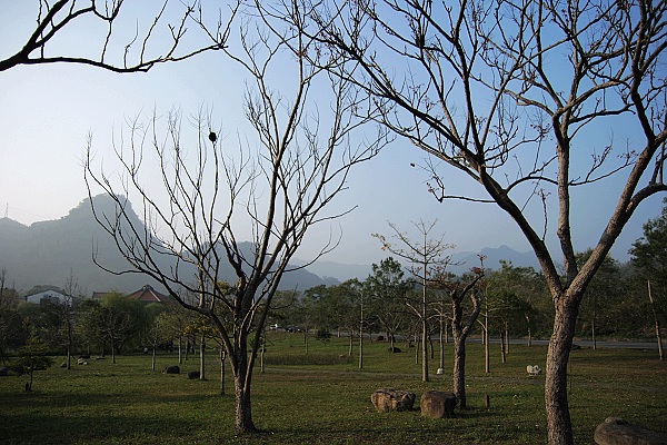 天空染著微微的橘紅,偎在山邊,穿過嫩枝。我們伴著夕陽下山,慢慢的滑回到太湖溫泉營地。